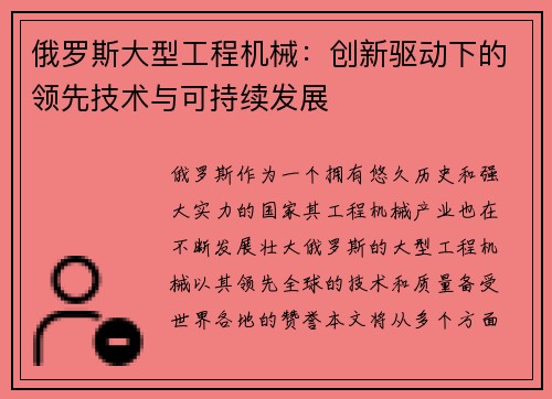 俄罗斯大型工程机械:创新驱动下的领先技术与可持续发展